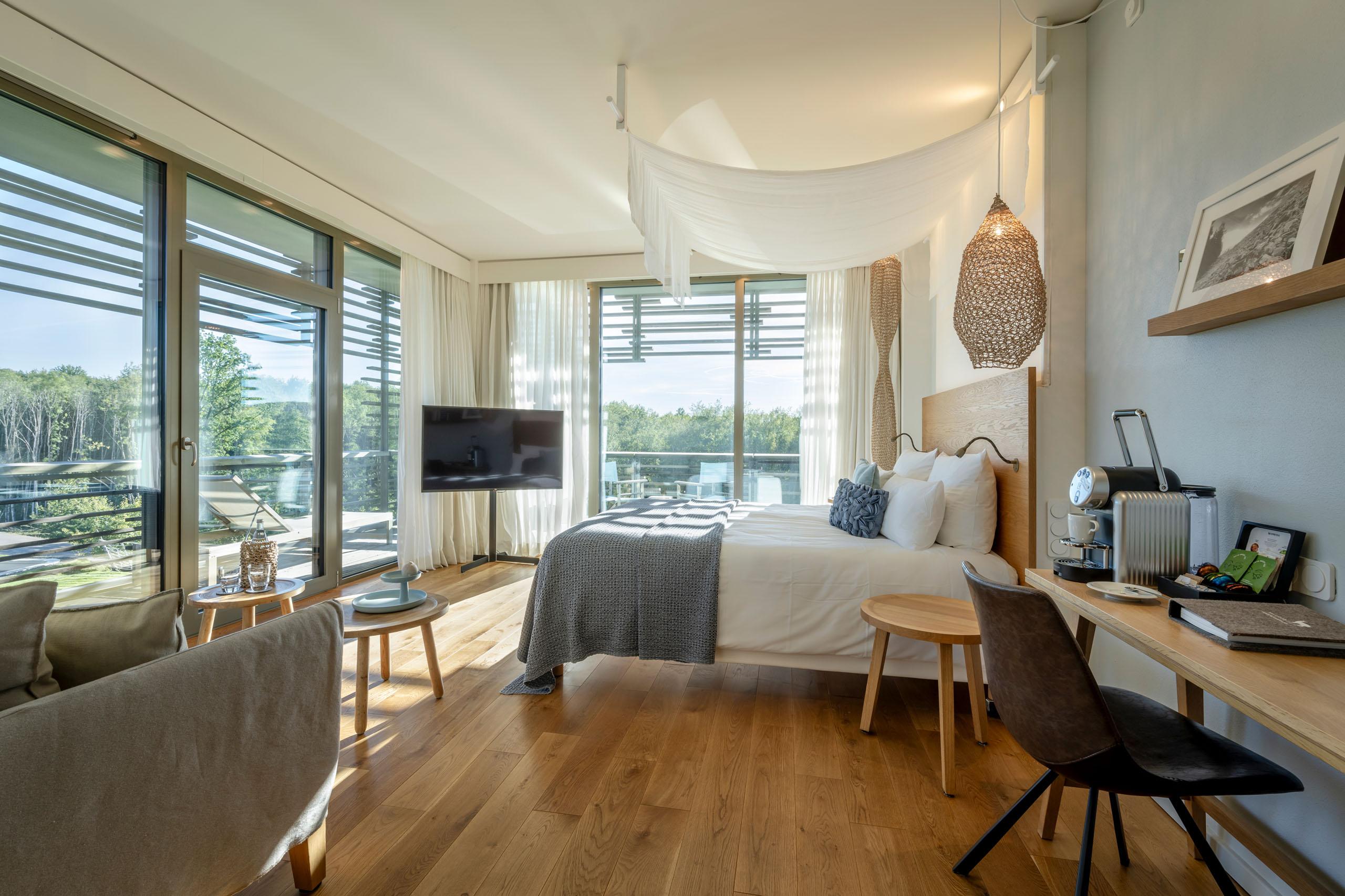 Atouts : chambre en angle avec grande baie vitrée, coin nuit dans pièce à vivre, lit boxspring king size, canapé, console, mini-réfrigérateur, enceintes Bluetooth, machine à café Nespresso avec sélection de café et de thé, grande salle de bains baignée de lumière naturelle avec douche à effet pluie, sac de spa avec pantoufles, peignoir et serviettes de sauna, service de couverture. Situées au 2e étage, les petites suites « À l’orée des bois » donnent sur le village de saunas en plein air, notre petit coin de paradis.