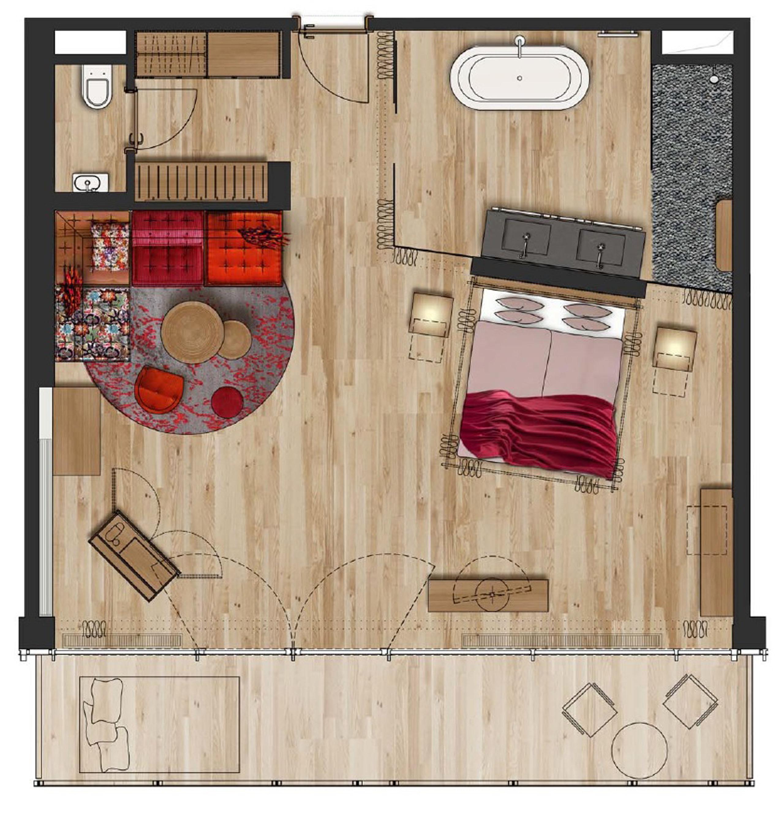 Schöne Details: verbundenes Wohnen und Schlafen, Kingsize-Boxspringbett, Schreibtisch, Nespressomaschine mit Kaffee- und Teeauswahl, Bluetooth-Musikboxen, Spa-Tasche mit Slippern, Bademantel und Saunatüchern, abendlicher Aufdeckservice. Die Feuer Suite ist frontal zum See ausgerichtet und liegt im 1. Obergeschoss.